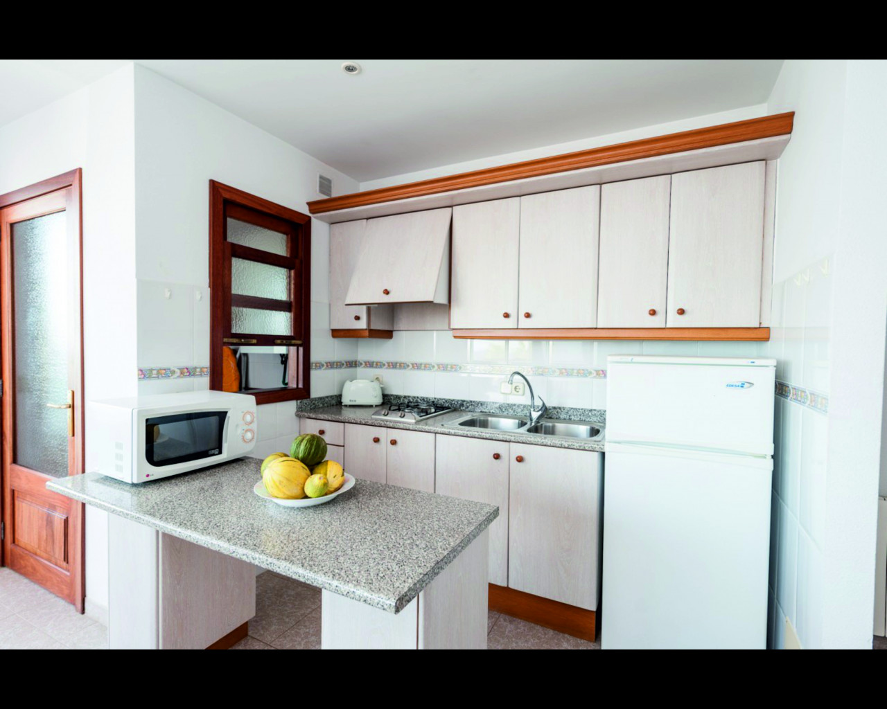 Cocina americana a gas, equipada con nevera, microondas, tostadora, cafetera, vajilla/cuberteria y utensilios de cocina.
