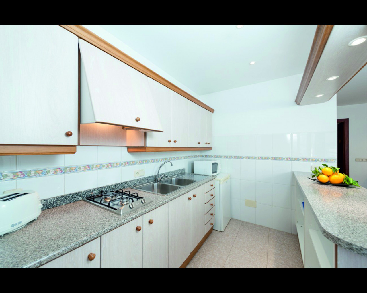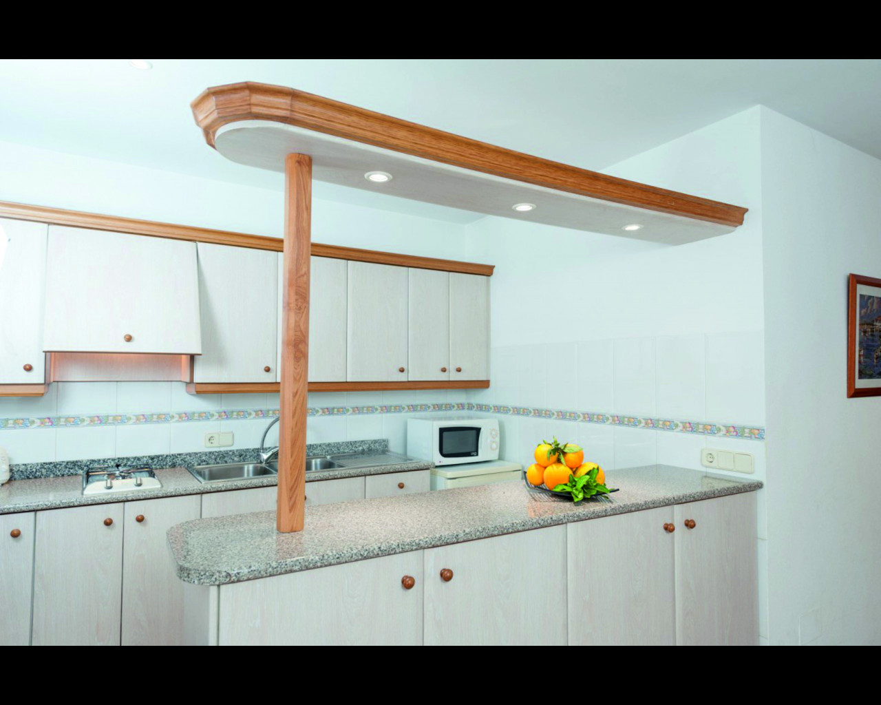 Cocina americana a gas, equipada con nevera, microondas, tostadora, cafetera, vajilla/cuberteria y utensilios de cocina.